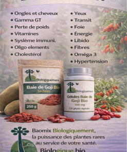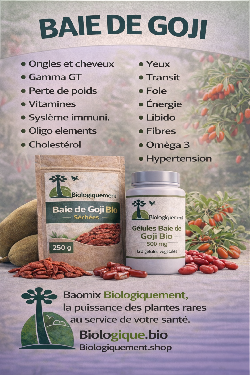 ✔️ Les baies de goji sont reconnues pour leurs puissantes propriétés anticancer, grâce à leur richesse exceptionnelle en antioxydants, polysaccharides et caroténoïdes qui protègent les cellules contre les radicaux libres et le stress oxydatif. Elles renforcent le système immunitaire, favorisent la régénération cellulaire et aident à maintenir un équilibre naturel dans l’organisme. Utilisées depuis des millénaires en Chine et dans les régions himalayennes comme élixir de longévité, elles étaient consommées pour prévenir les maladies graves et prolonger la vitalité. Aujourd’hui, elles sont considérées comme un superaliment incontournable pour accompagner le corps dans sa protection cellulaire et sa lutte contre les déséquilibres.