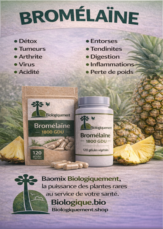 ✔️ Aujourd’hui, la bromélaïne est l’une des enzymes les plus étudiées au monde, particulièrement pour son rôle dans la lutte contre les inflammations et comme adjuvant naturel dans les protocoles anticancer.